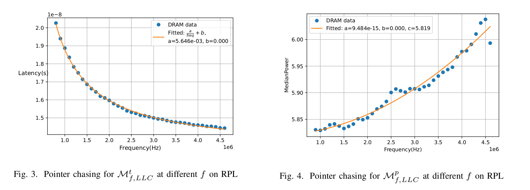 g) Curve fitting on miss penalty. For analytical modeling over the uncore component, we use non-linear curve fitting on the space of uncore frequencies to obtain \(\mathcal{M}^{t}_{f,LLC}\) and \(\mathcal{M}^{p}_{f,LLC}\) with (f) as a parameter. For example, on the RPL platform in Fig. 3, we show the curve fitting over a range of uncore frequencies for miss latency using Eq. (6).