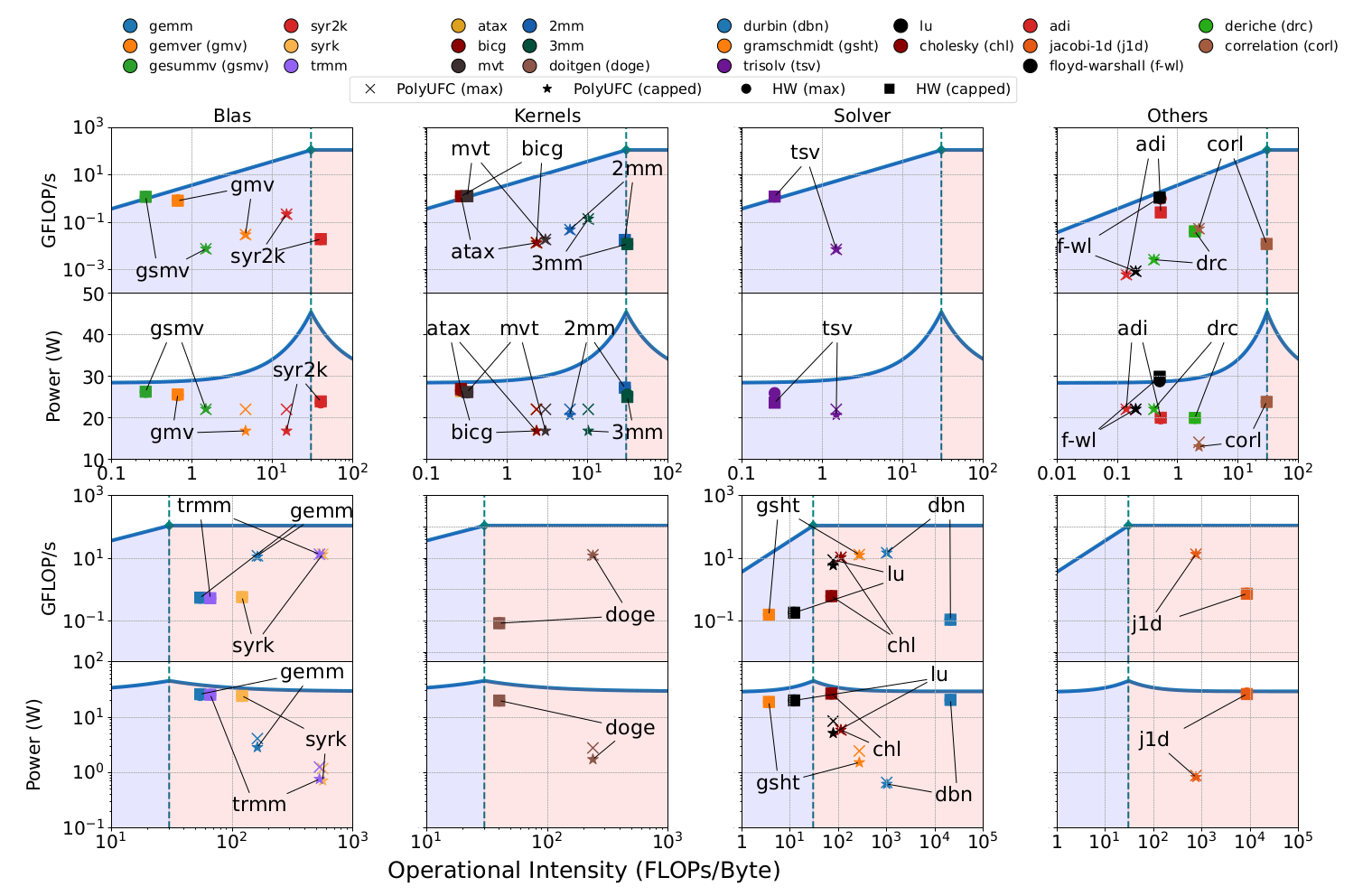 Fig. 2. Performance and Power Characterization on BDW for PolyBench with large problem size. Vertically, from top to bottom, the characterization of programs shifts from BB → CB due to higher OI.